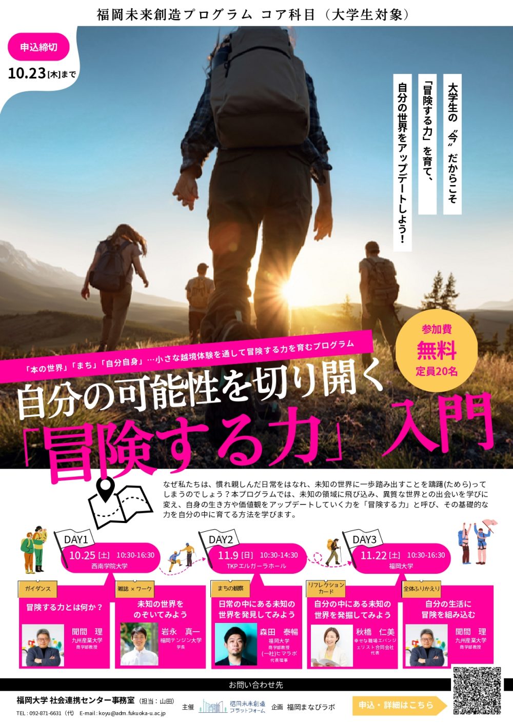 自分の可能性を切り開く「冒険する力」入門(第1回) 10:30 – 16:3010/25 詳細はこちらをご覧ください。 西南学院大学 コミュニティーセンター西新6-2-92福岡市早良区, 福岡県 814-0002場所を表示 More information 詳細 カレンダーを表示